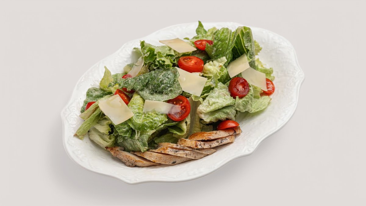 свежие листья романо и салата, сочная куриная грудка, спелые черри и хрустящие сухари из багета. Всё это щедро заправлено классическим соусом «Цезарь» и посыпано тёртым пармезаном.