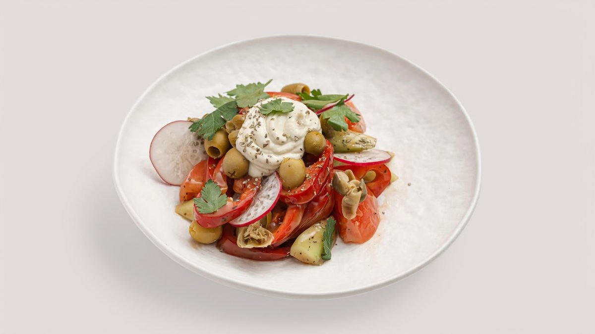 Огурец, перец рамиро, томаты, крем из оливок, оливки, красный лук, редис, каперсы, заправка греческая, орегано