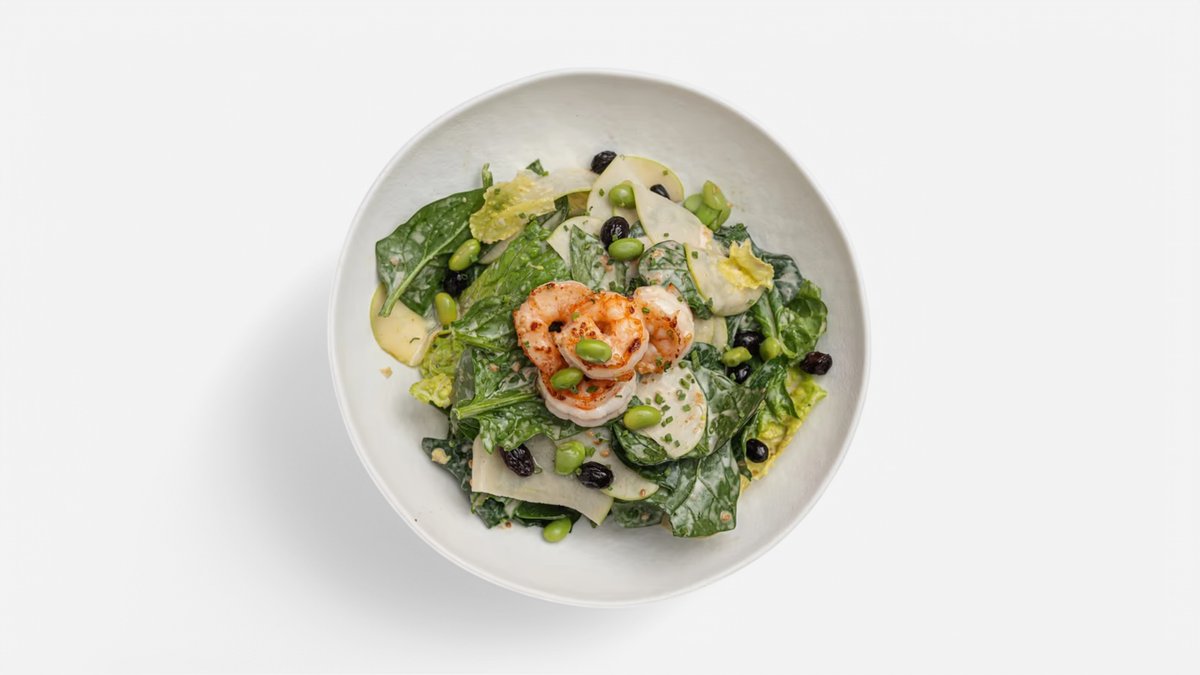 Креветки, шпинат, романо, яблоко, цукини, брокколи, изюм, эдамаме, фисташки, сибулет, кунжутный дрессинг.