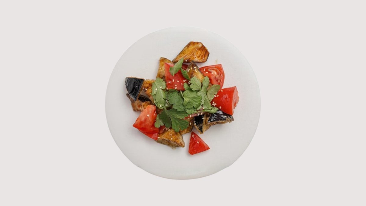 Баклажан, крахмал, томаты, кинза-чили соус, кедровый орех, кинза, сибулет