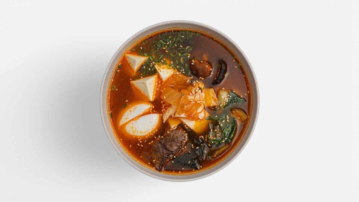 Лапша рамен, копченная говядина, соевый соус, специи, куриное яйцо, тофу, шиитаке, пак-чой, зеленый лук, кимчи, кунжут.