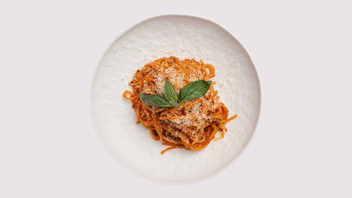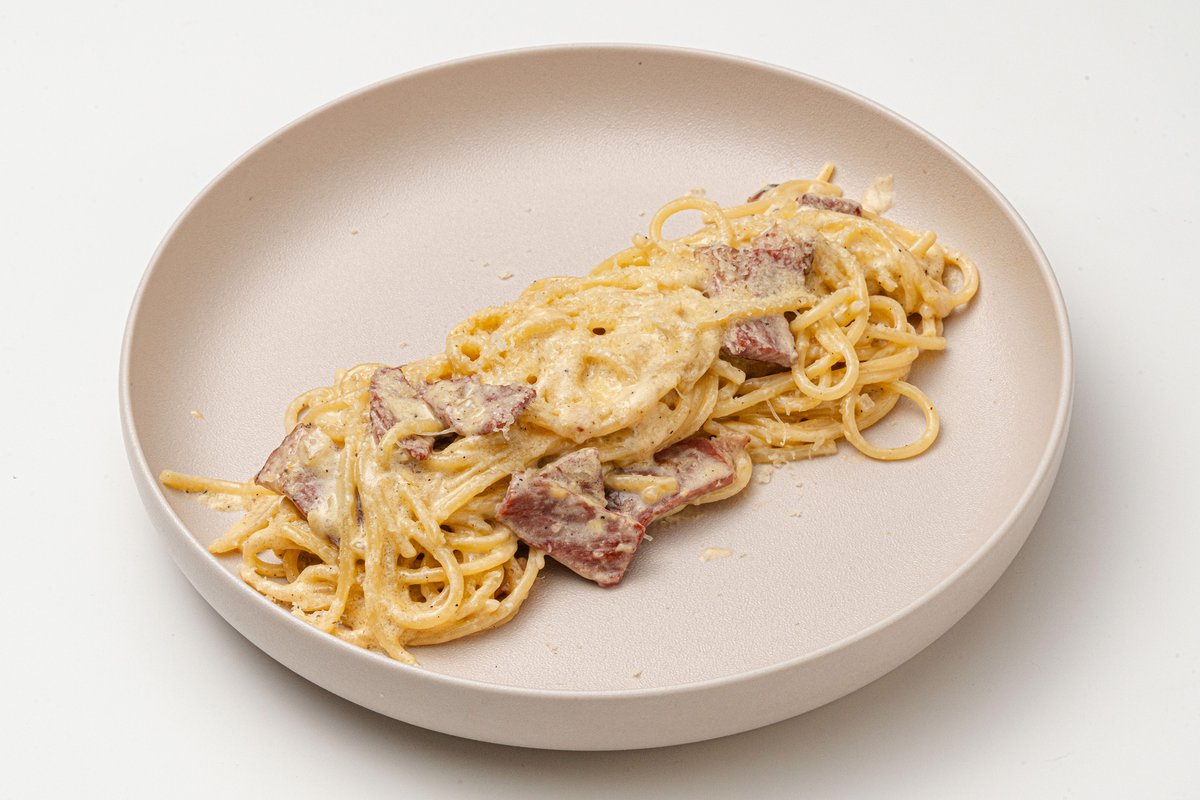 спагетти с соусом на основе яиц, сыра пармезан, поджаренного беконом из говядины и свежемолотого чёрного перца. С добавлением сливок