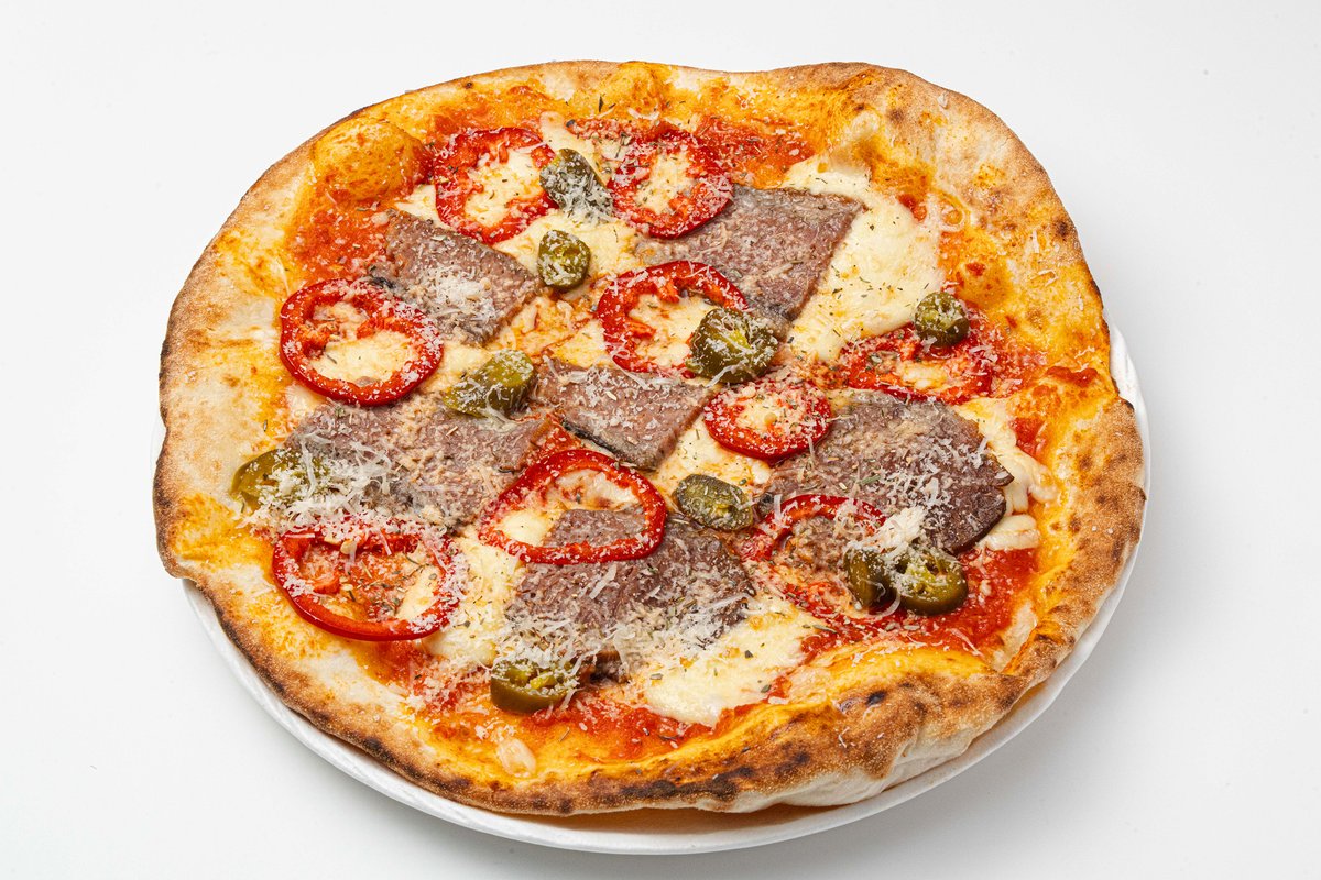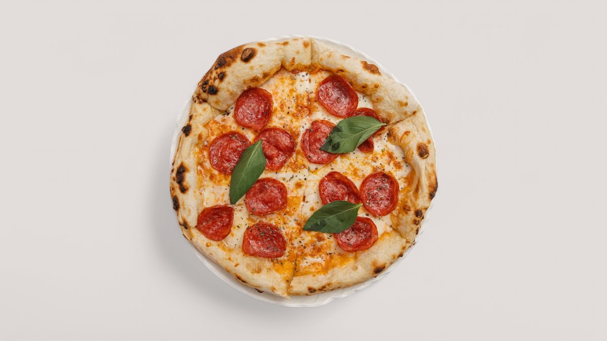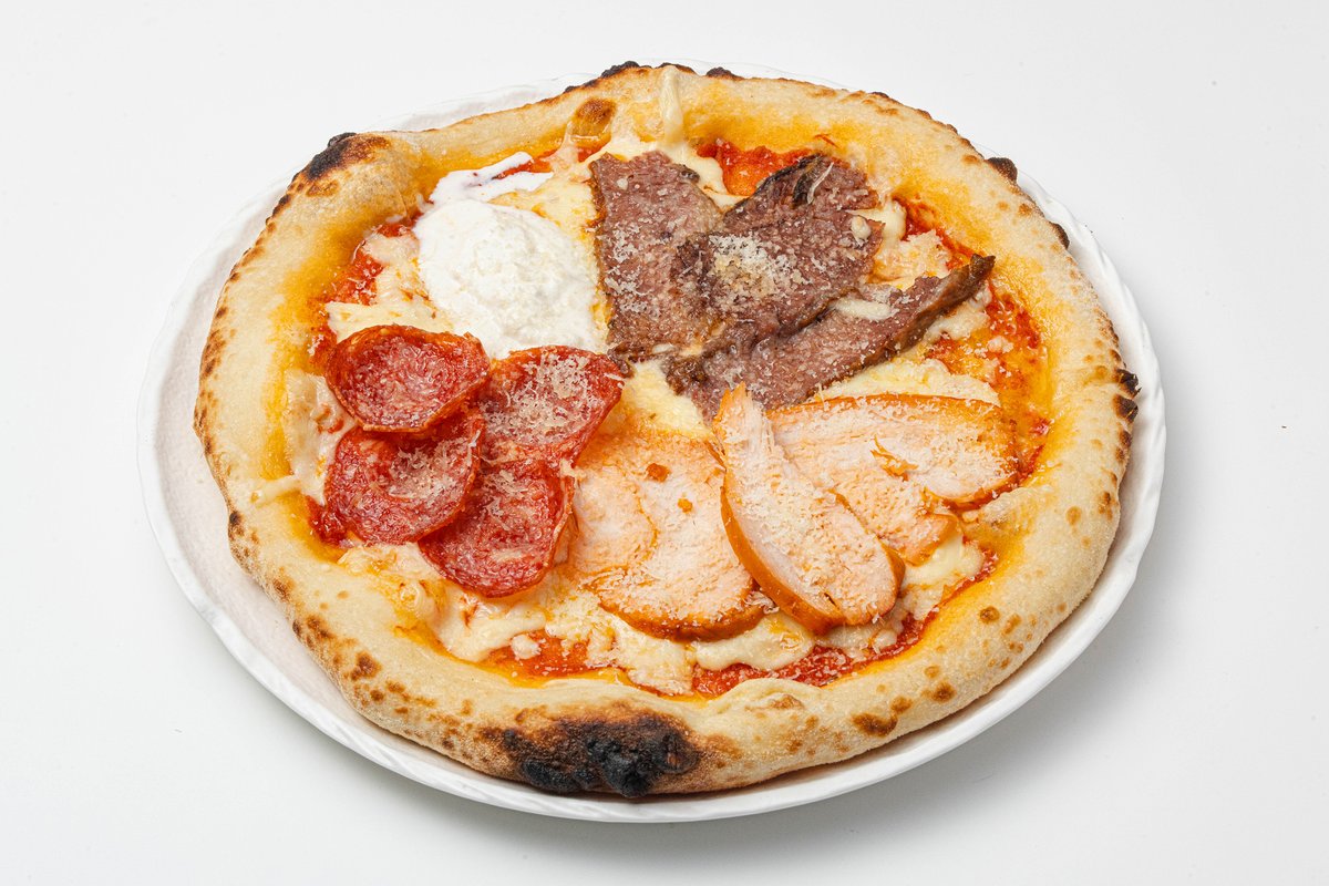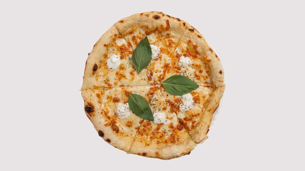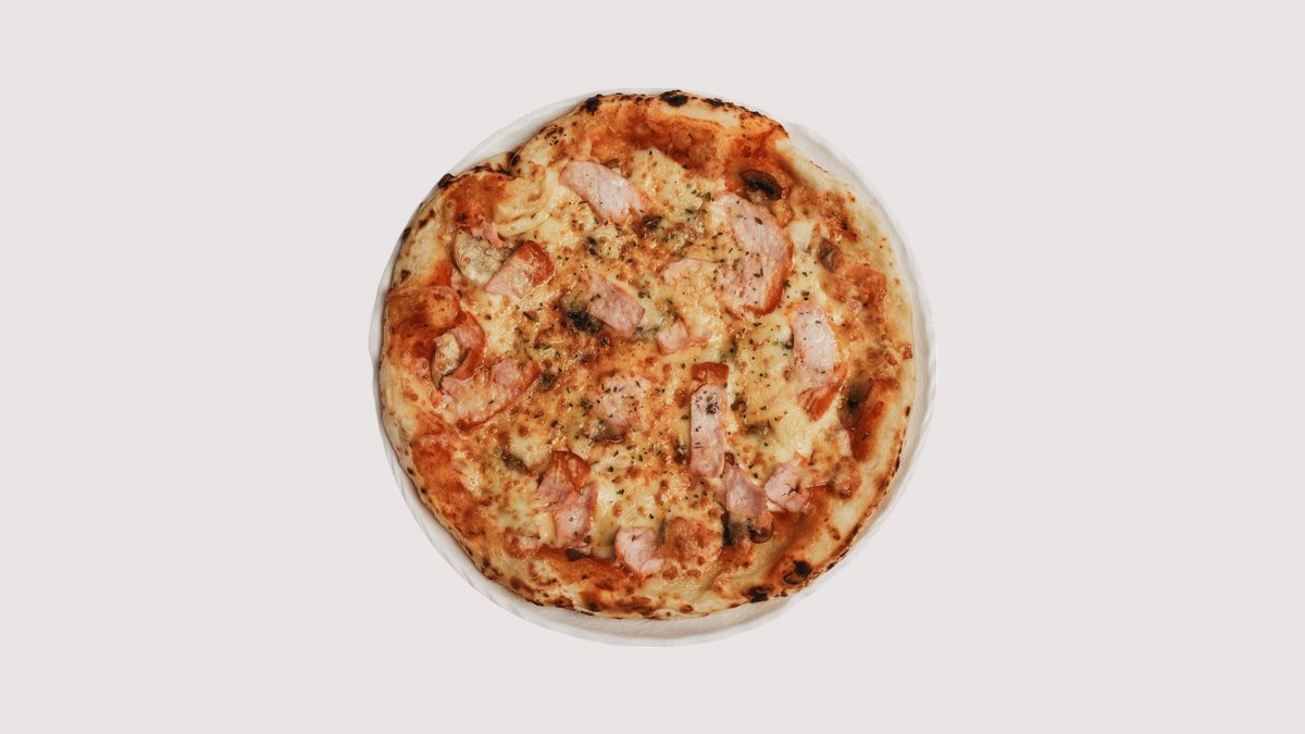 Томатная база, курица копченная, жаренные грибы, моцарелла, пармезан, базилик, орегано.