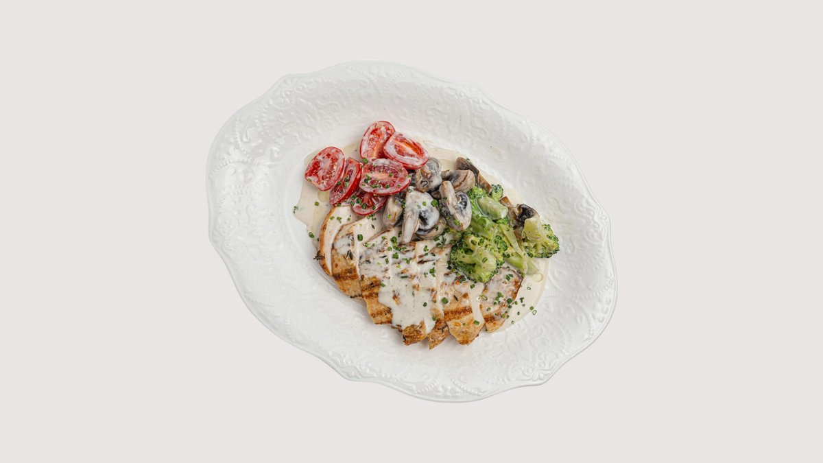 Куриное филе, сливки, сливочное масло, брокколи, шампиньоны, томаты черри, сибулет.
