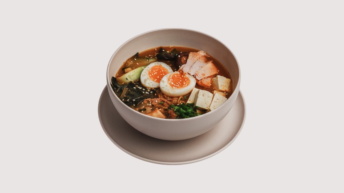 Лапша рамен, копченная курица, соевый соус, специи, куриное яйцо, тофу, шиитаке, пак-чой, зеленый лук, кимчи, кунжут.