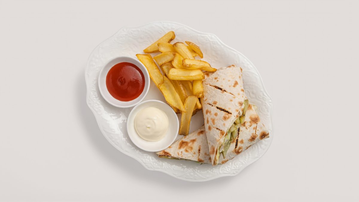Лаваш, маринованный цыпленок, маринованные огурцы, картофель фри лодочки, соус, кетчуп.