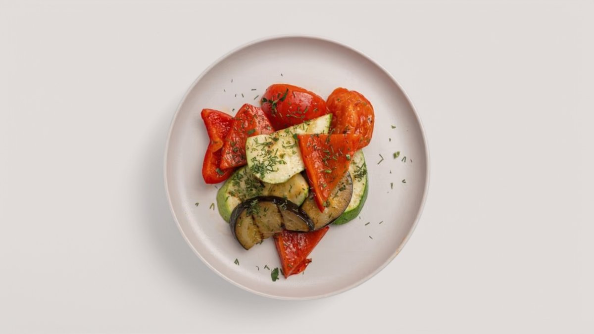 Кабачки, баклажан, томаты, перец рамиро, масло растительное, соль, перец, зелень.