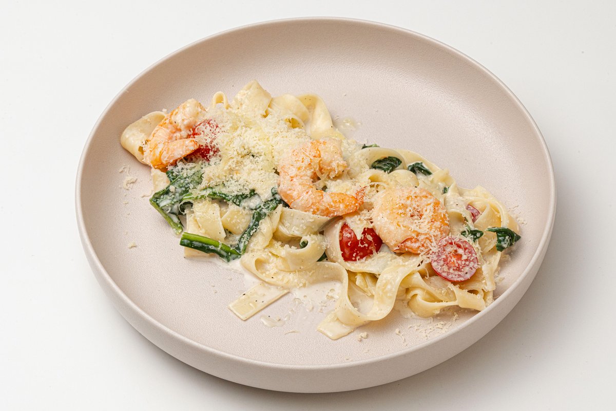 — паста с креветками, томатами черри, шпинатом в сливочном соусе, украшена пармезаном, базиликом и имитацией красной икры.