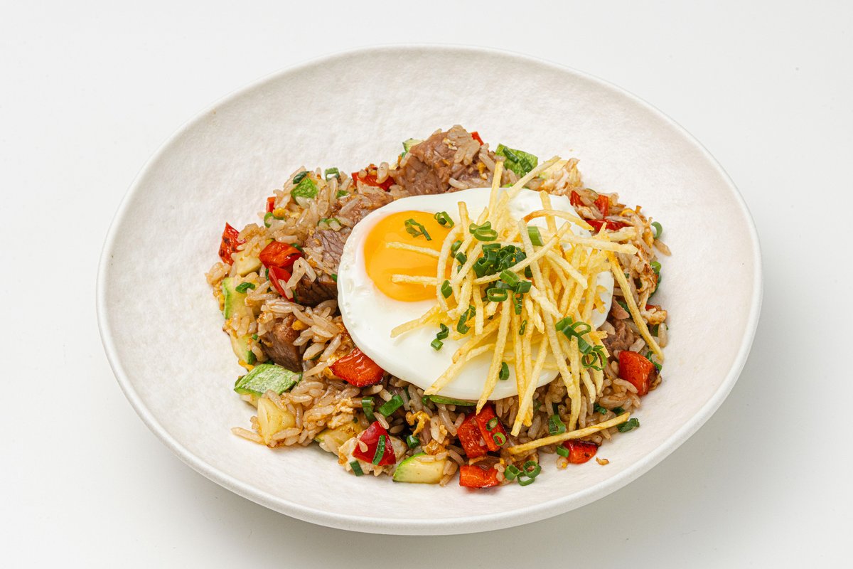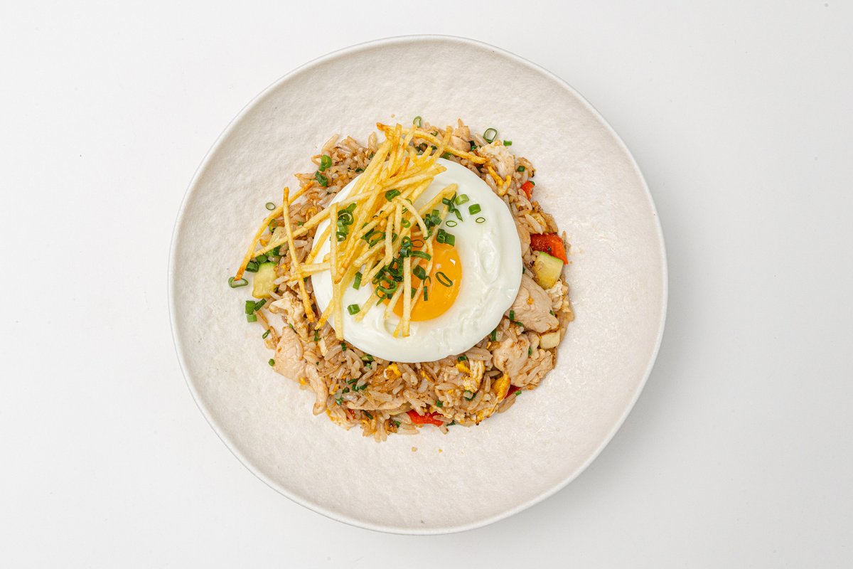 сочная маринованная куриная грудка с рисом, перцем и овощами, обжаренные с яйцом, соусом терияки и сливочным маслом, украшенные зелёным луком и картофельным паем зелёным луком. .