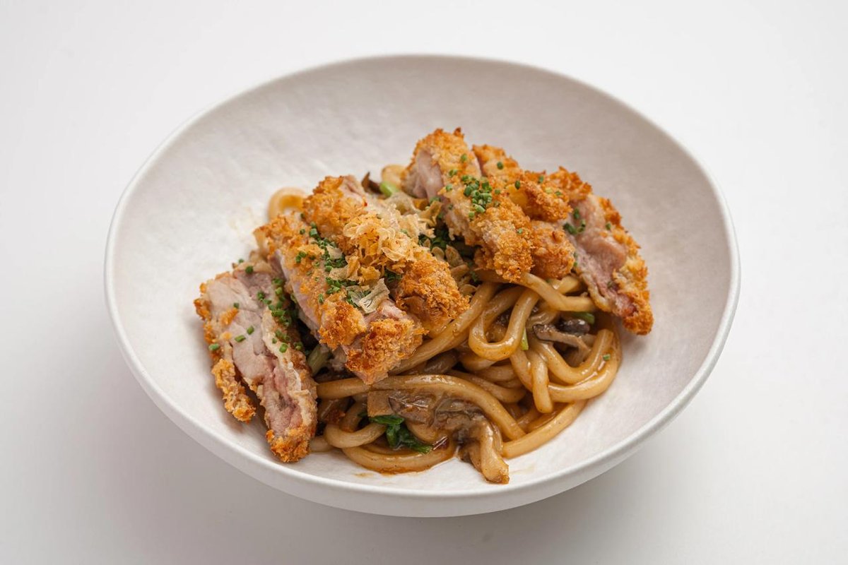 удон с панированной куриной грудкой, бульгоги, вешенками и овощами, заправленный соусом терияки и сливочным маслом, с хрустящими чесночными чипсами