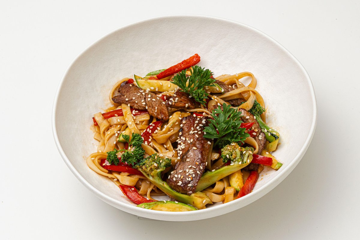 нежные ломтики сочной говядины в сочетании со свежими овощами и хрустящей зеленью азиатским соусом