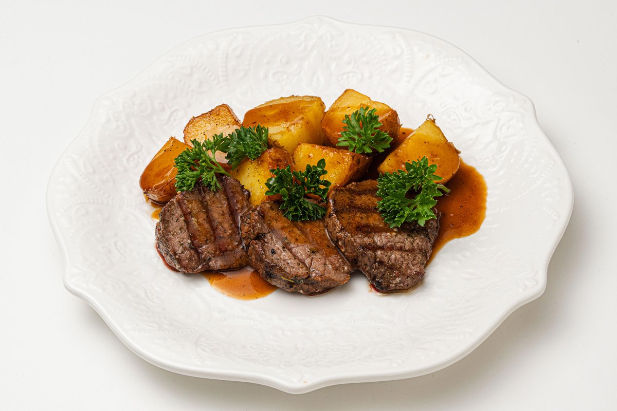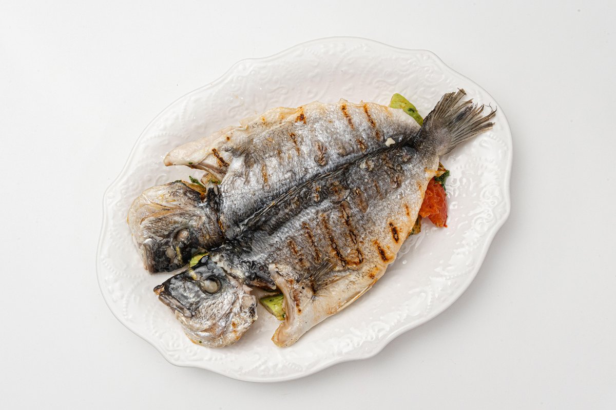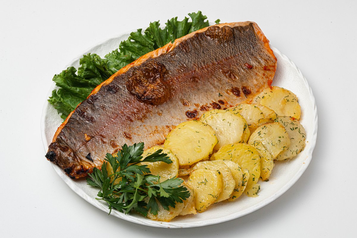 — нежная рыба, запечённая до золотистой корочки с ароматными специями. Подаётся с картофелем, сливочным соусом с каперсами, свежей зеленью и лимоном.