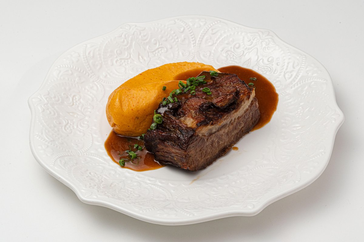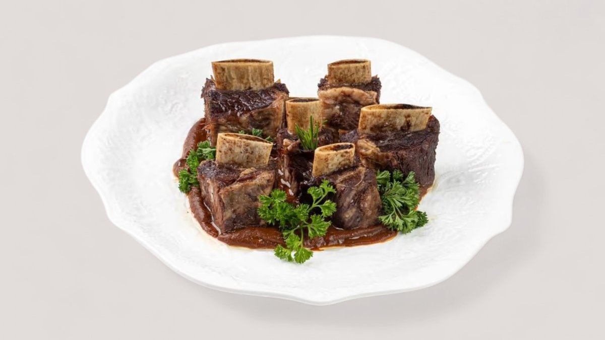 Говяжье ребро с пряными травами Нежное говяжье ребро, томлённое до идеальной мягкости и пропитанное ароматом пряных трав. Каждая порция — насыщенный вкус, который раскрывается медленно и богато.