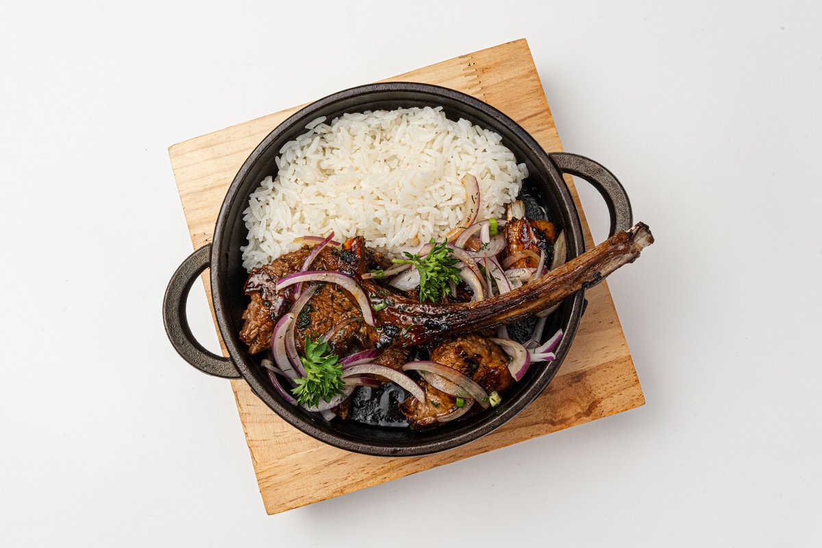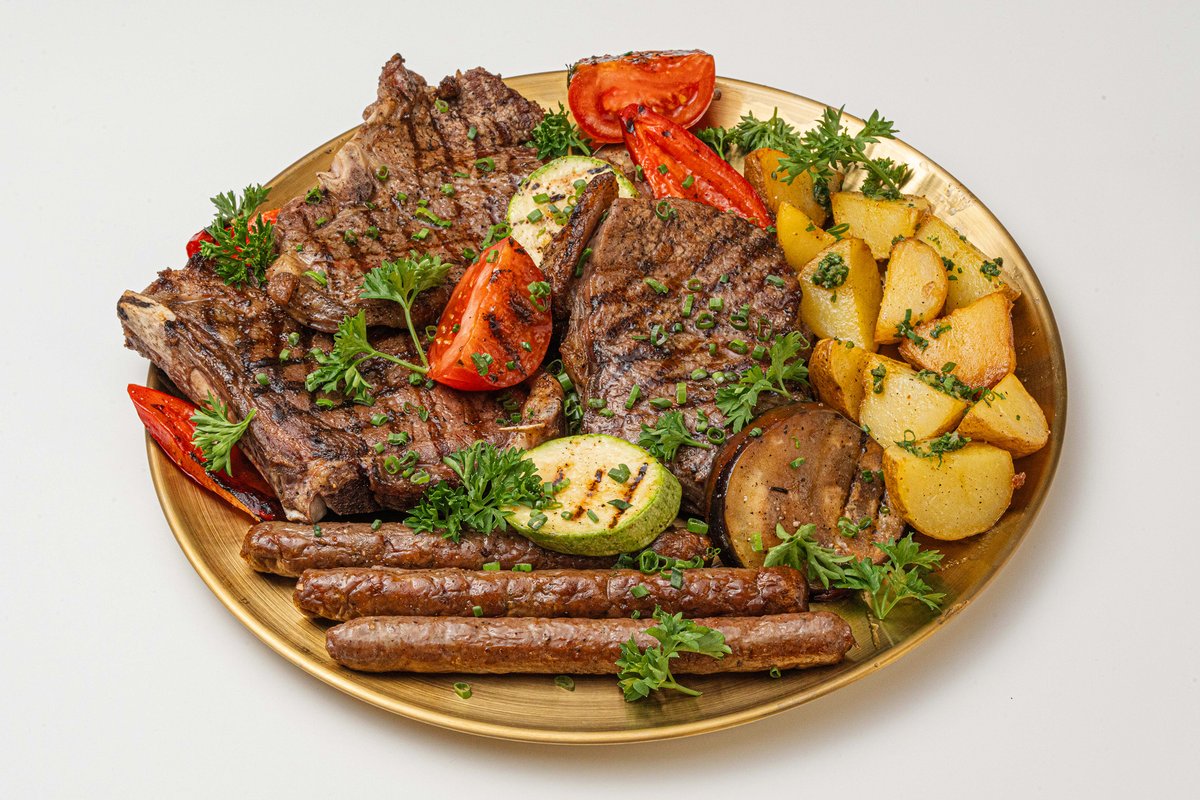 роскошное ассорти для настоящих гурманов. Тибон, рибай из говядины и конины, колбаски трёх видов (говяжьи, куриные и из конины), а также сочные бараньи рёбрышки. В комплекте — ароматные овощи на гриле, золотистый картофель, аджика и перечный соус.
