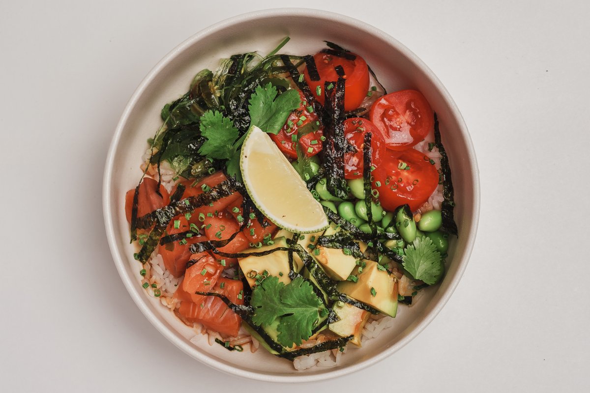 — яркая и сбалансированная чаша: нежный лосось, рис для роллов, авокадо, эдамаме и томаты черри. Дополняют вкус водоросли чука, соус томаки, лайм, нори и белый кунжут.