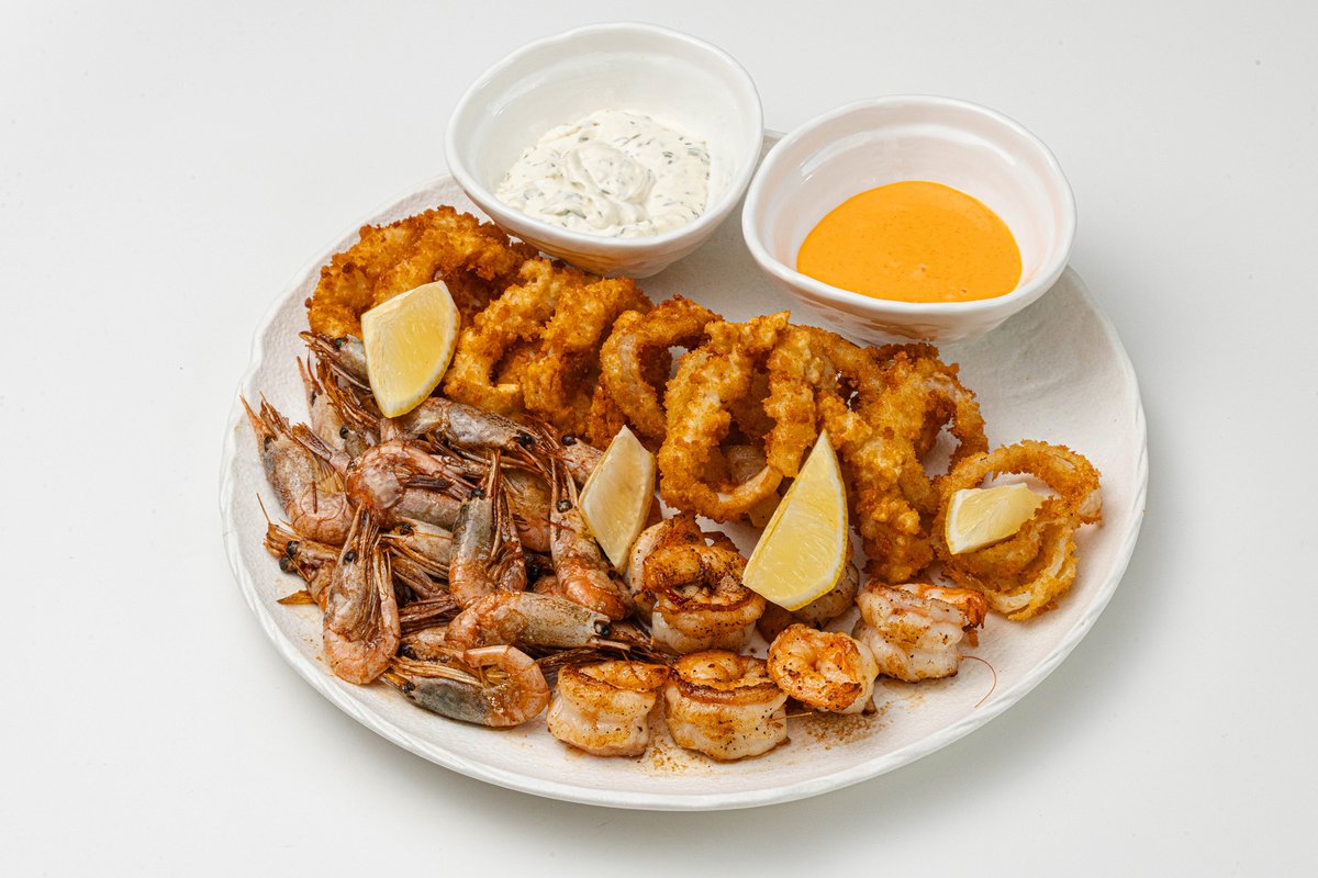 — аппетитное сочетание морских деликатесов: золотистые луковые кольца, пивные креветки, жареные тигровые креветки. нежные кальмарные кольца. Подаются с соусами спайси и тар тар .