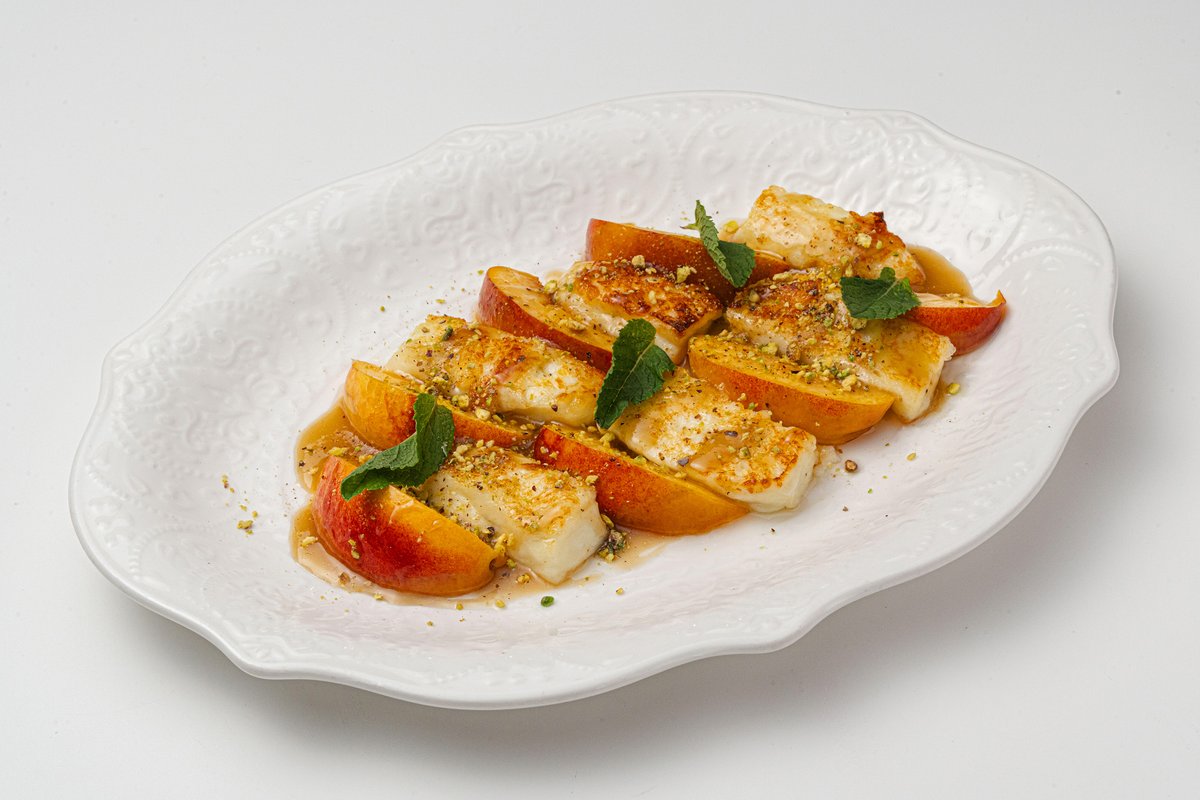 — нежные сырники из иримшика, подаются с вишнёвым вареньем, свежей мятой и дроблёным фундуком