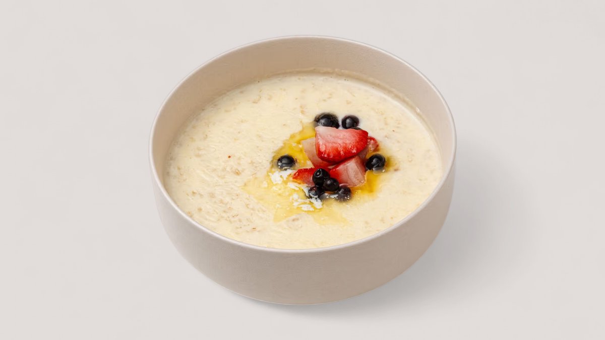 — нежная, сливочная и по-домашнему уютная. Дополнена свежей клубникой и голубикой, которые придают лёгкую кисло-сладкую нотку и делают завтрак не только сытным, но и полезным.