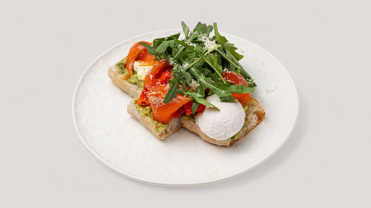 нежные яйца на хрустящем багете с гуакомоле, сладким печёным перцем, слабосолёным лососем и свежей зеленью.