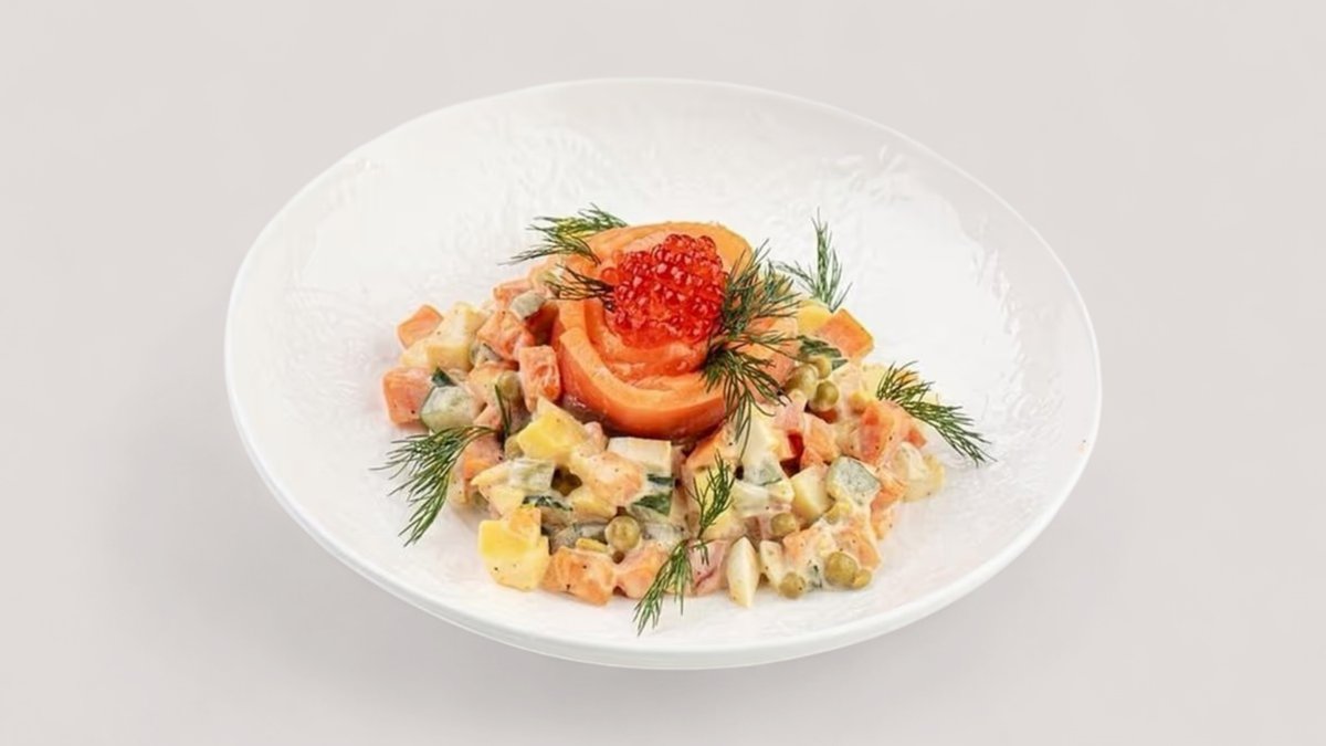 Премиальная интерпретация любимого салата: нежный лосось, зернистая красная икра и лёгкий соус. Роскошный вкус, который делает любой вечер особенным.