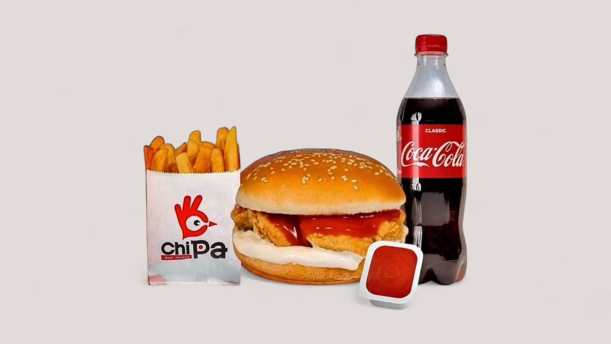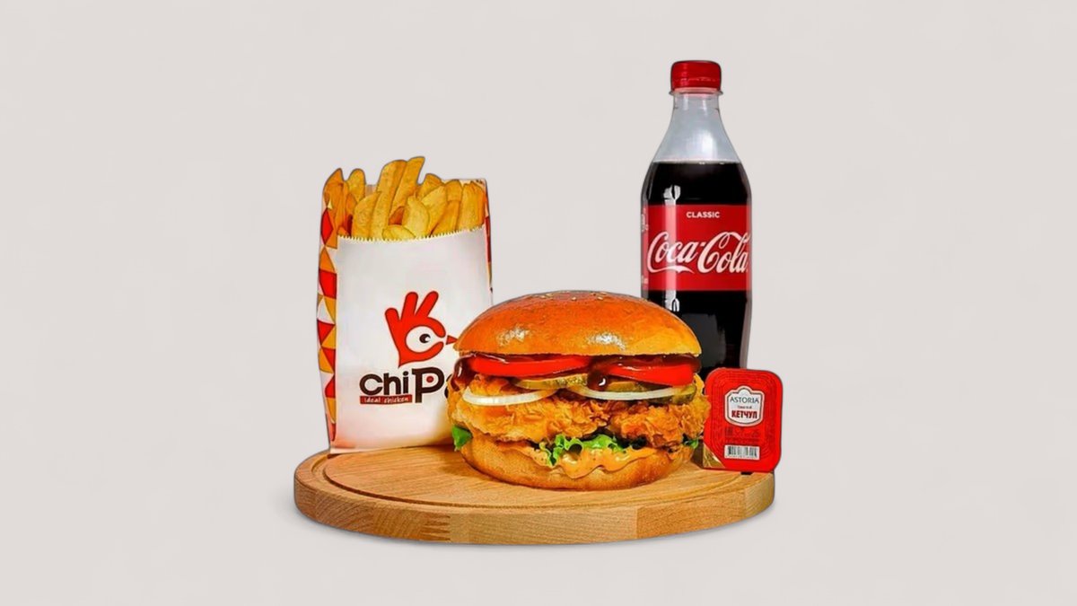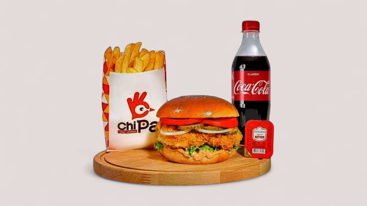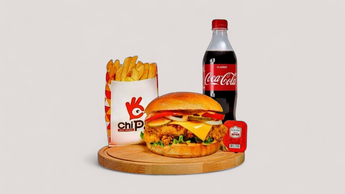 Чипа бургер на выбор, стандартный фри, кола 0,5л, соус кетчуп.