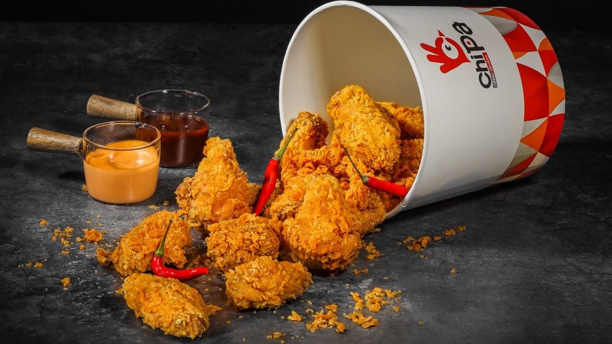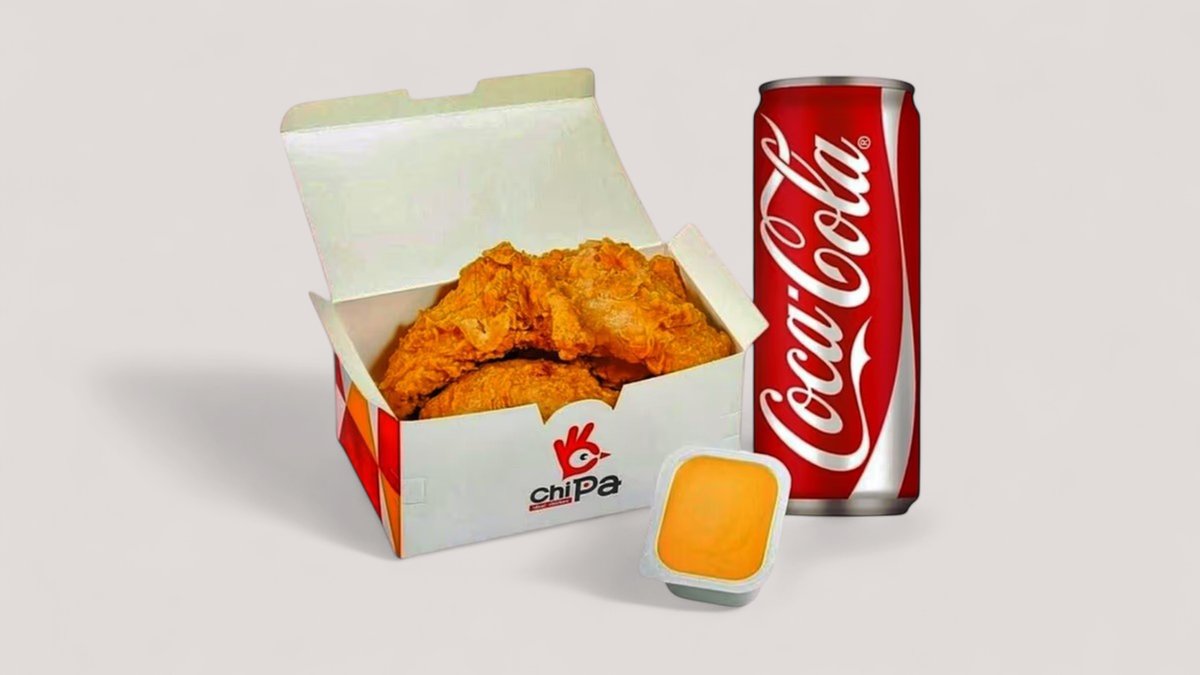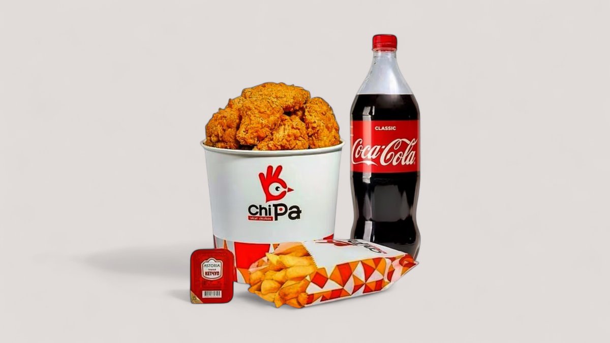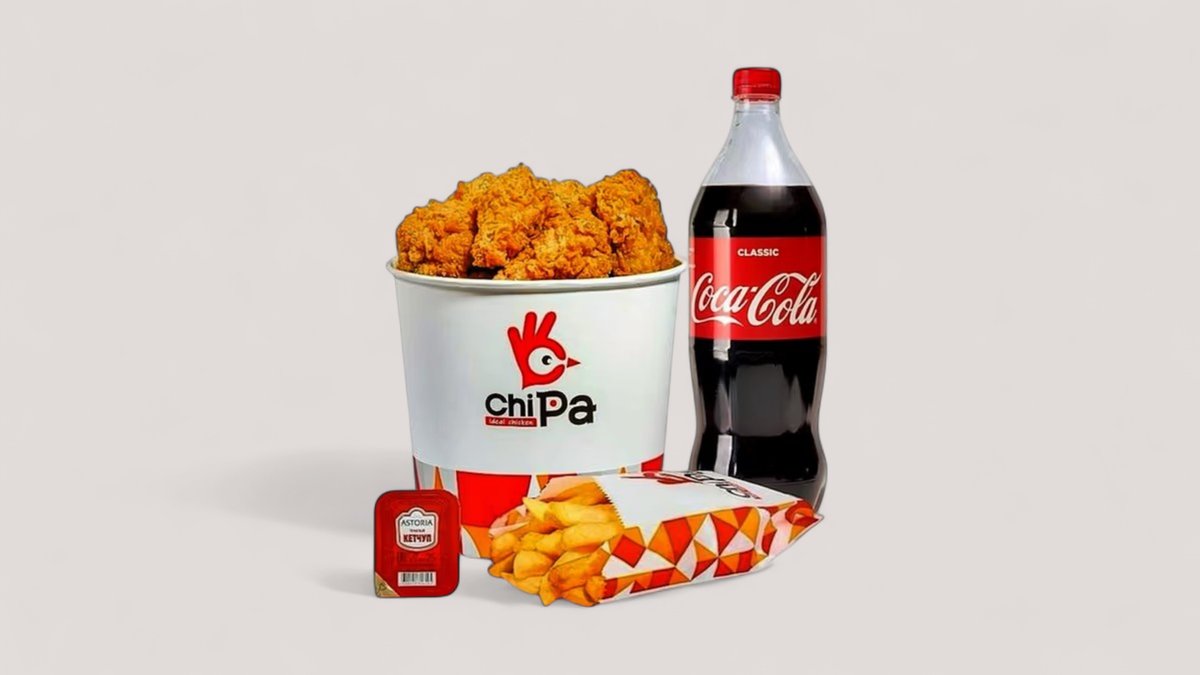 Чипа бургер на выбор, стандартный фри, кола 0,5л, соус кетчуп.