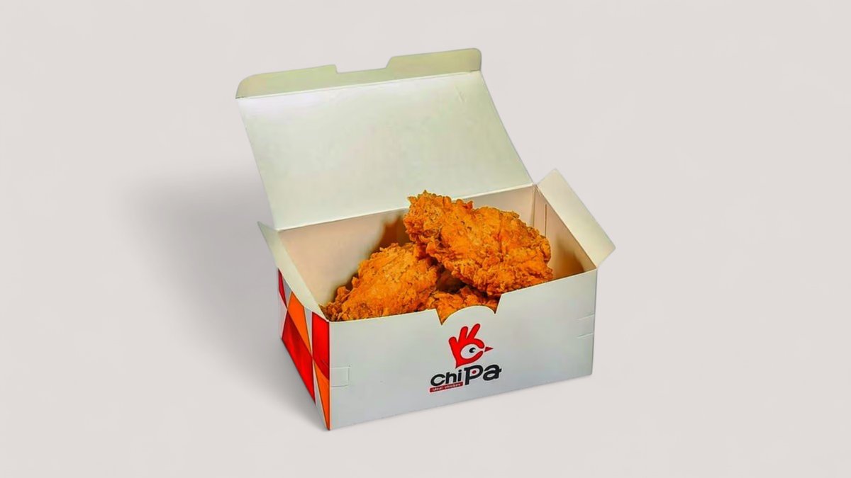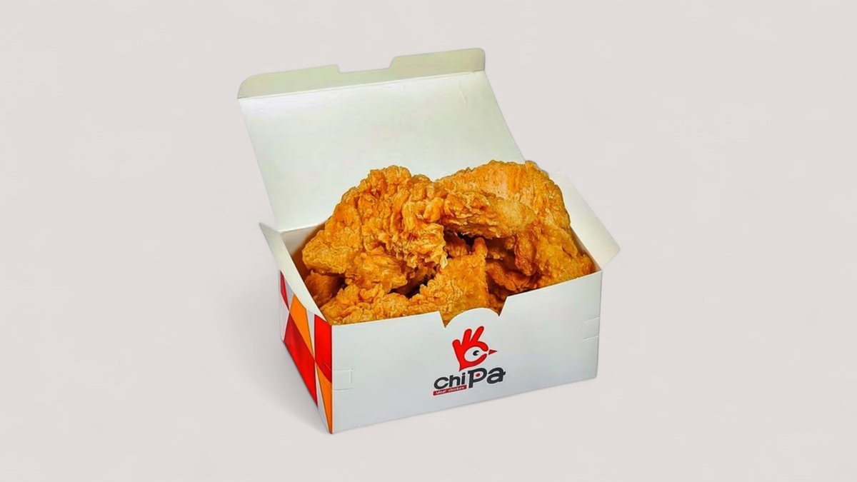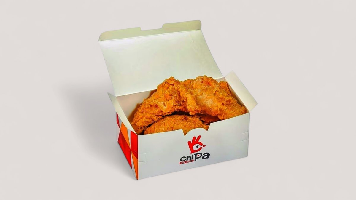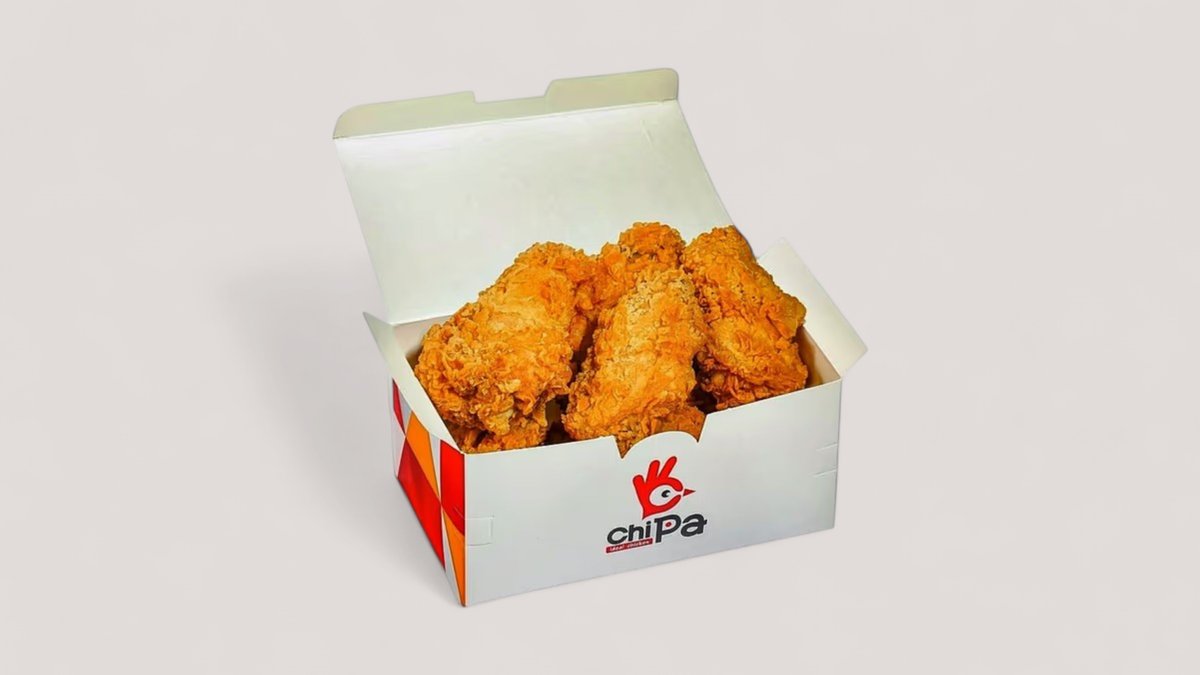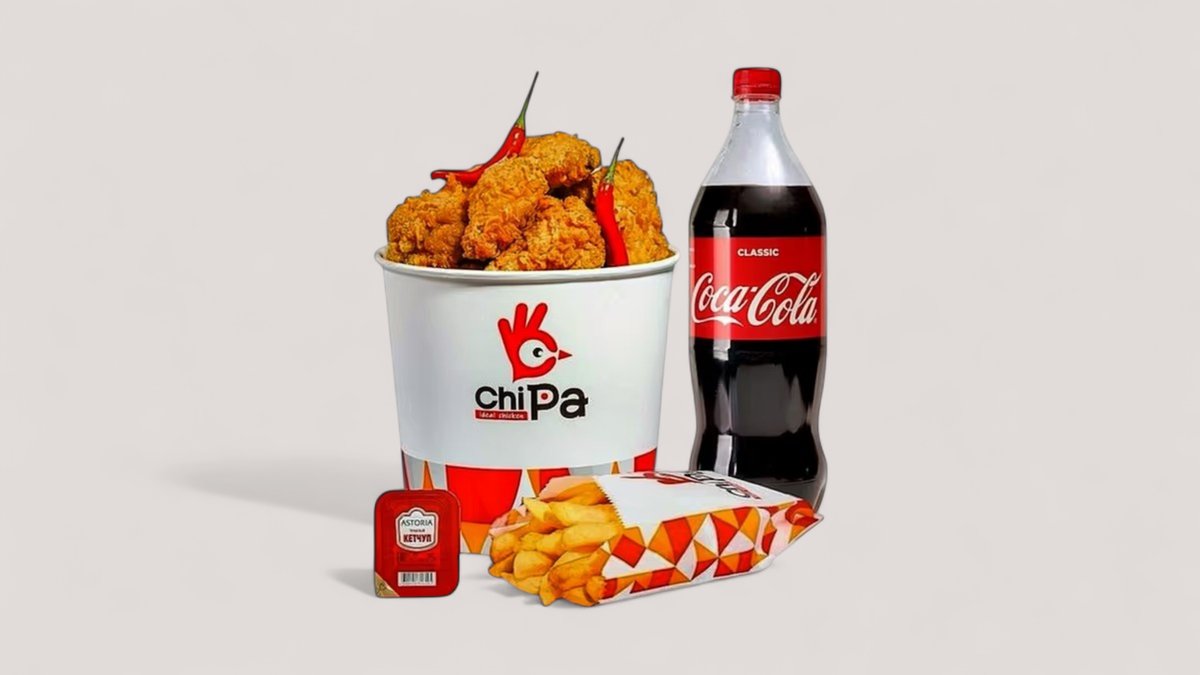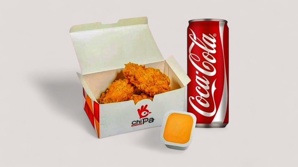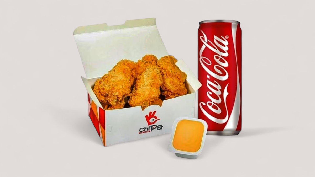 6 острых крылышек, 8 оригинальных стрипс, кола 1л, фри бокс, соус кетчуп.