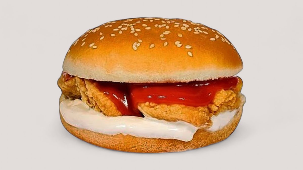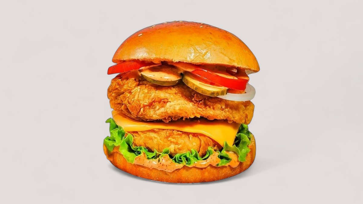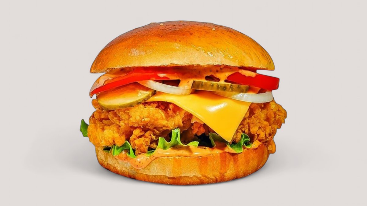 Свежая булочка, сочное куриное филе 2 шт., ломтик сыра, фирменный соус, салат айсберг, помидор, лук, соленый огурчик.