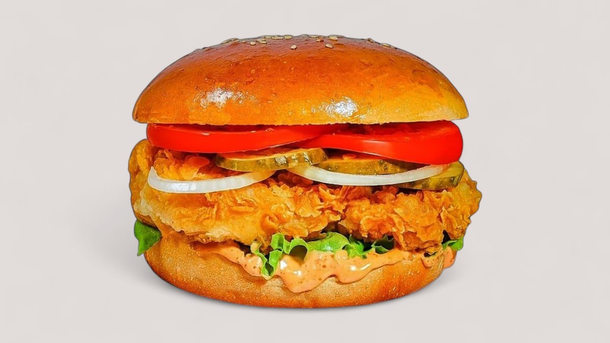 Свежая булочка, сочное куриное филе, фирменный соус, салат айсберг, помидор, соленый огурчик, лук.