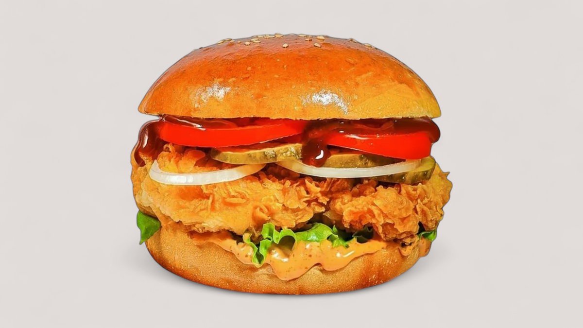 Свежая булочка, сочное куриное филе, соус барбекю, помидор, соленый огурчик, салат айсберг, лук.