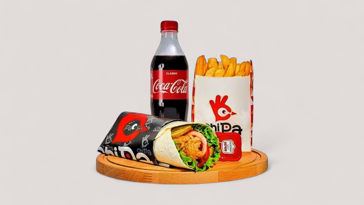 Чипа ролл на выбор, стандартный фри, кола 0,5л, соус кетчуп.