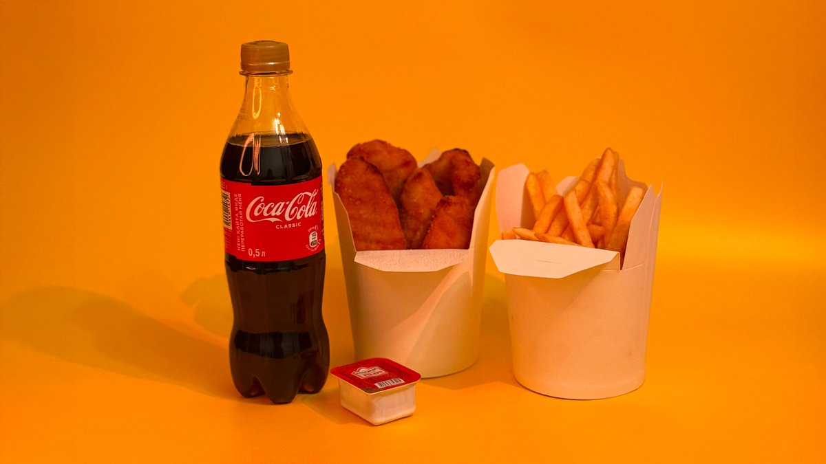 Стрипсы (5 шт) Картофель фри (1 шт) Соус (1 шт) Кола 0,5 л