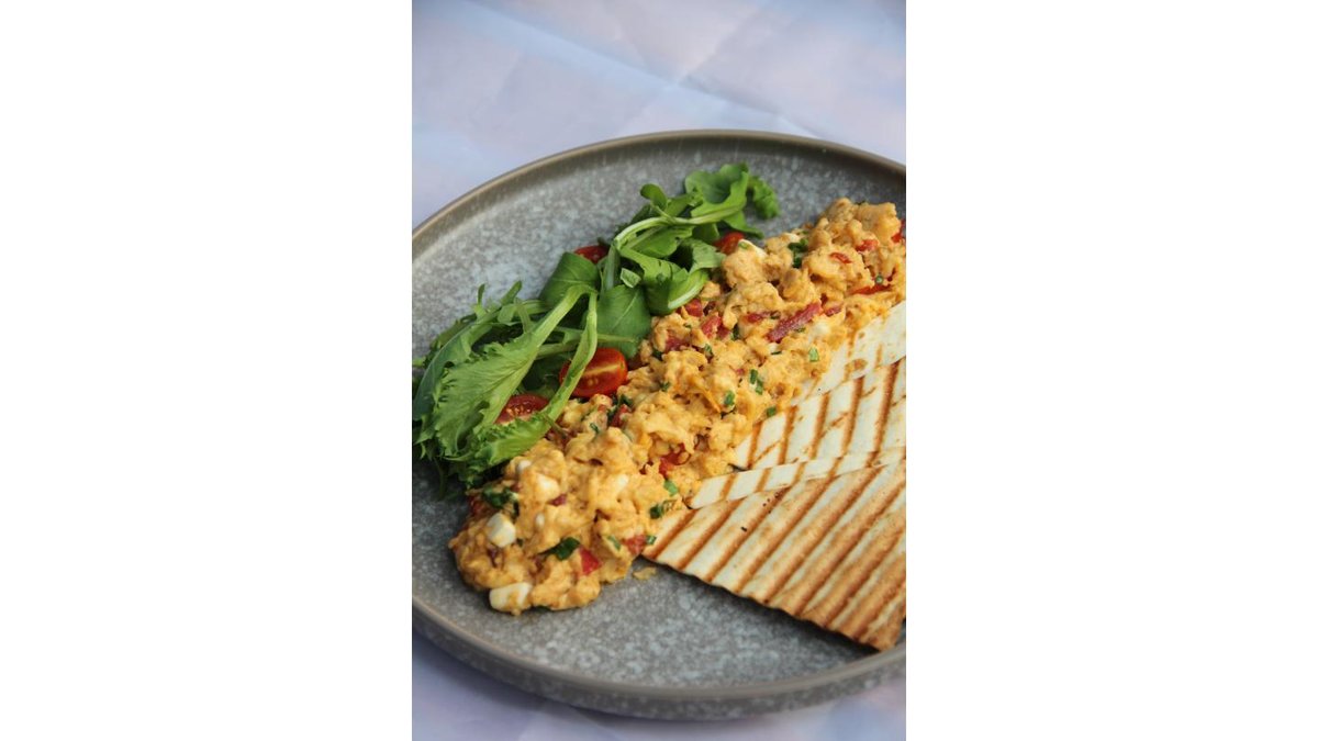 скрэмбл с томатами и сыром фета, подаётся с миксом салата и хрустящей тортильей