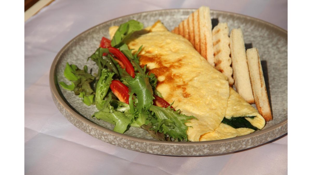 омлет с сыром, шпинатом и томатами, подаётся с миксом салата и хрустящим тостом