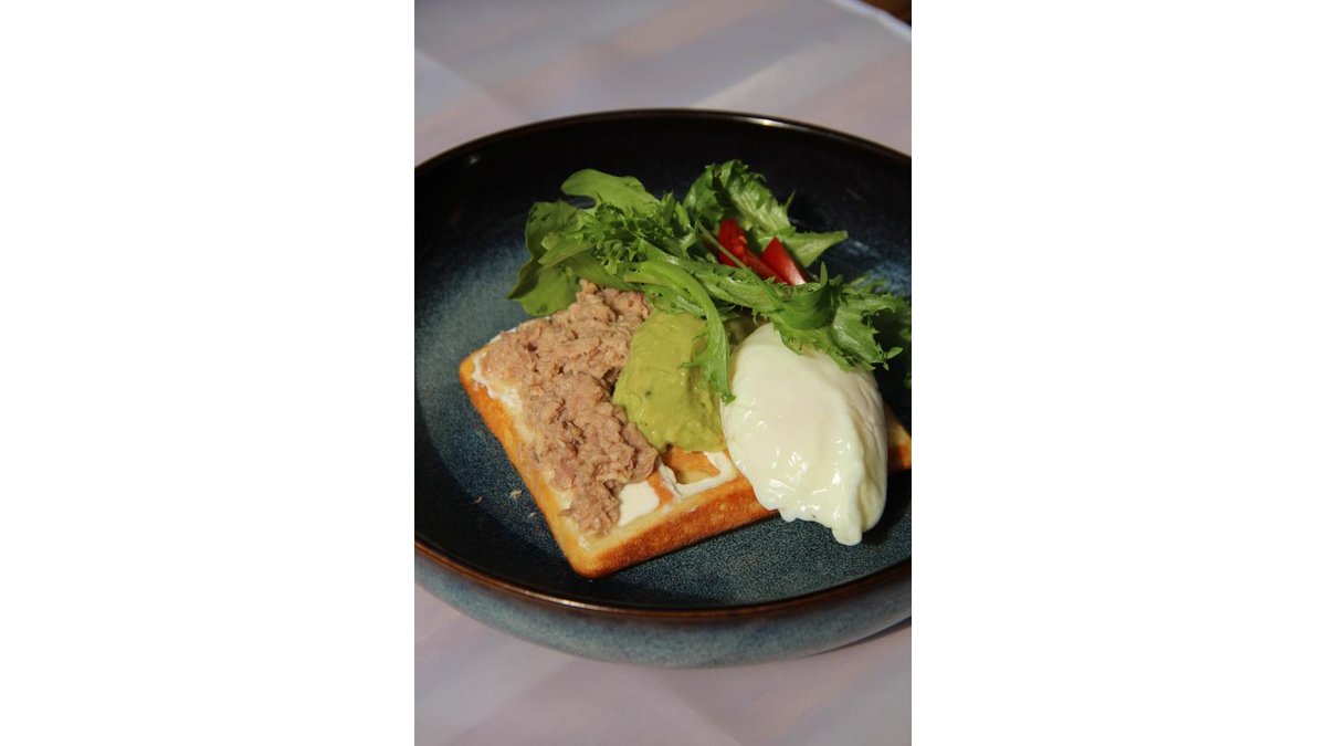 бельгийские вафли с творожным сыром, соусом гуакамоле, тунцом и яйцом пашот.