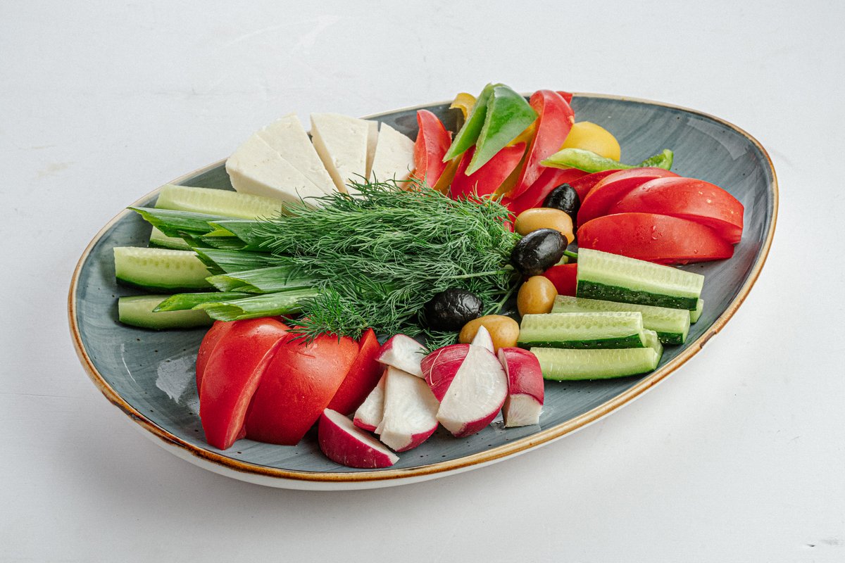 Свежие овощи, заправленные ароматным оливковым маслом и сыром фета