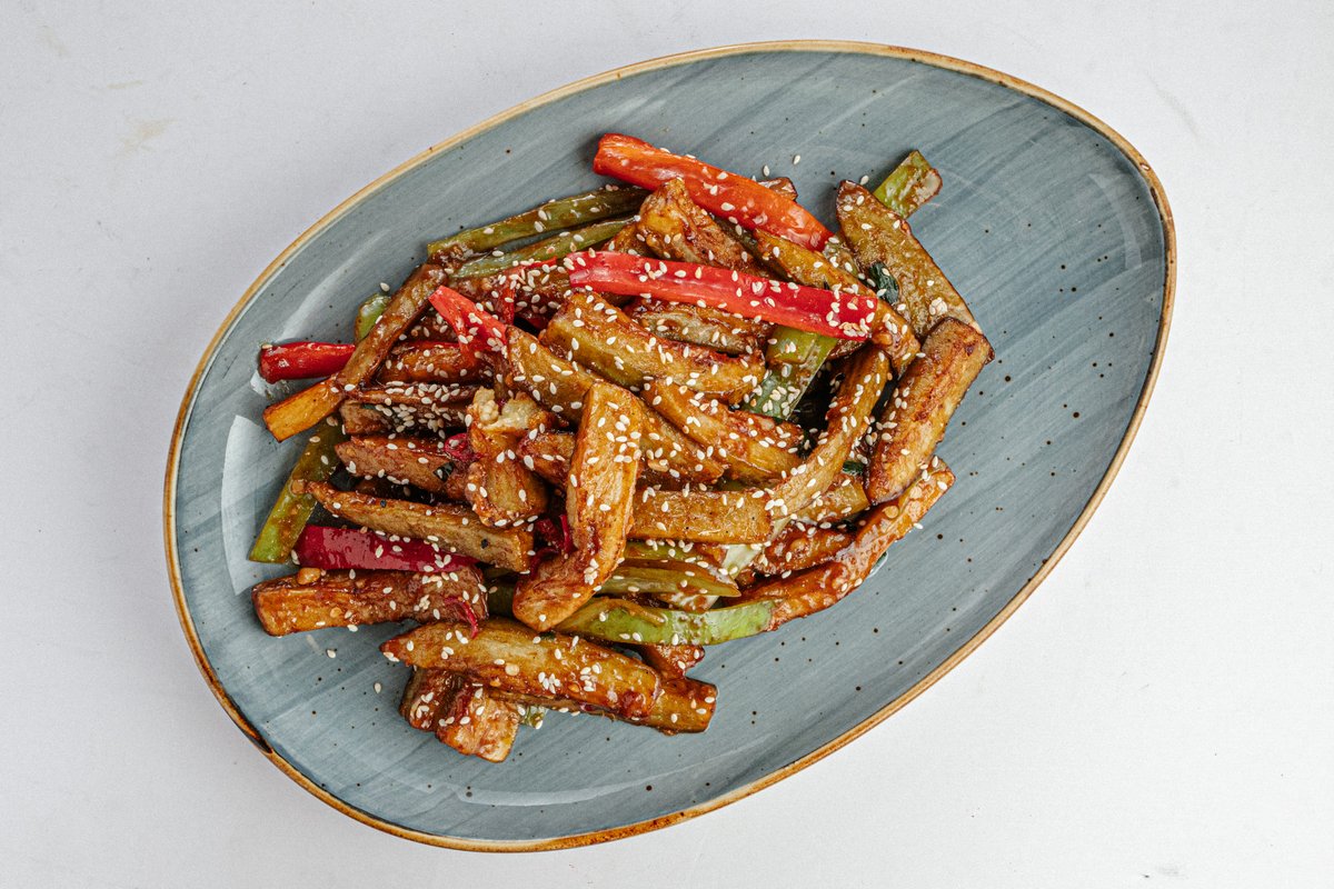 Обжаренные хрустящие баклажаны, с добавлением помидоров черри. Заправленный в азиатском соусе. Посыпается кунжутом и свежей кинзой