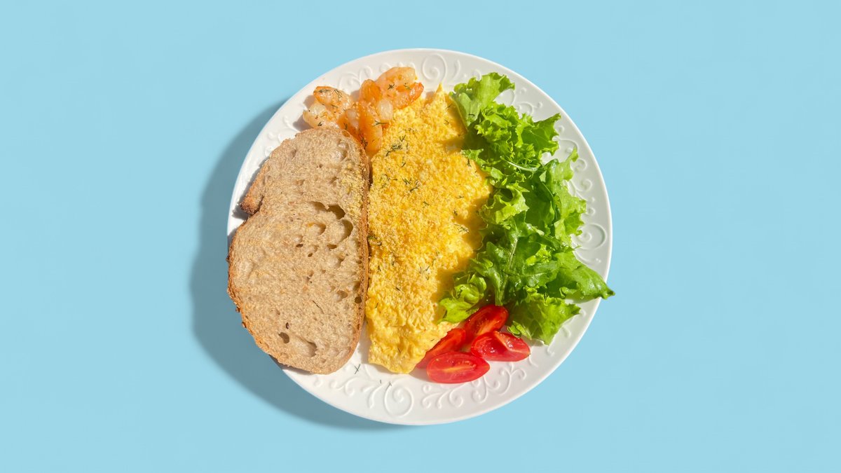 Французский омлет с креветками, тертым пармезаном и теплым чесночным маслом. Подается с микс-салатом и тостом.