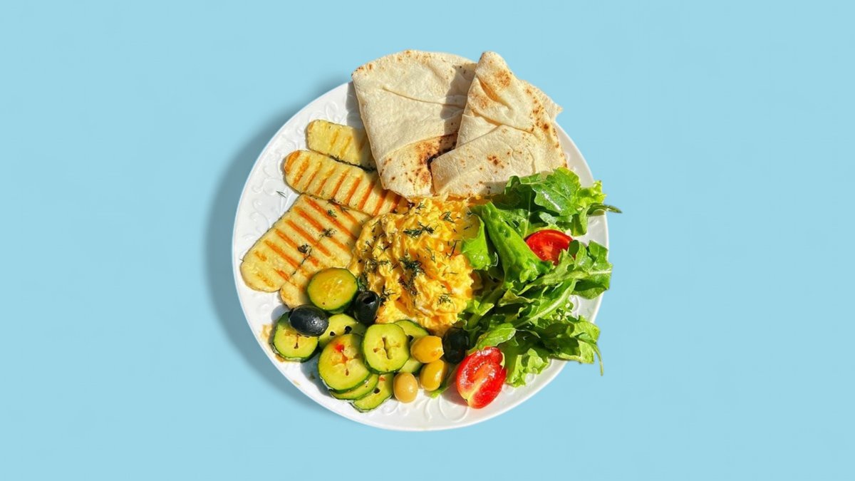 Теплая пита, скрембл, жареный халуми, свежие овощи и оливки.