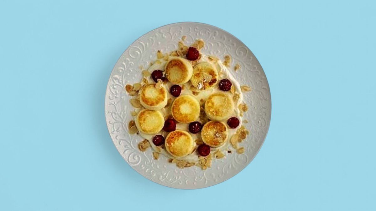 Сырники из фермерского творога с домашней сметаной, ванилью и сезонными ягодами. Посыпаны карамелизированными миндальными лепестками.