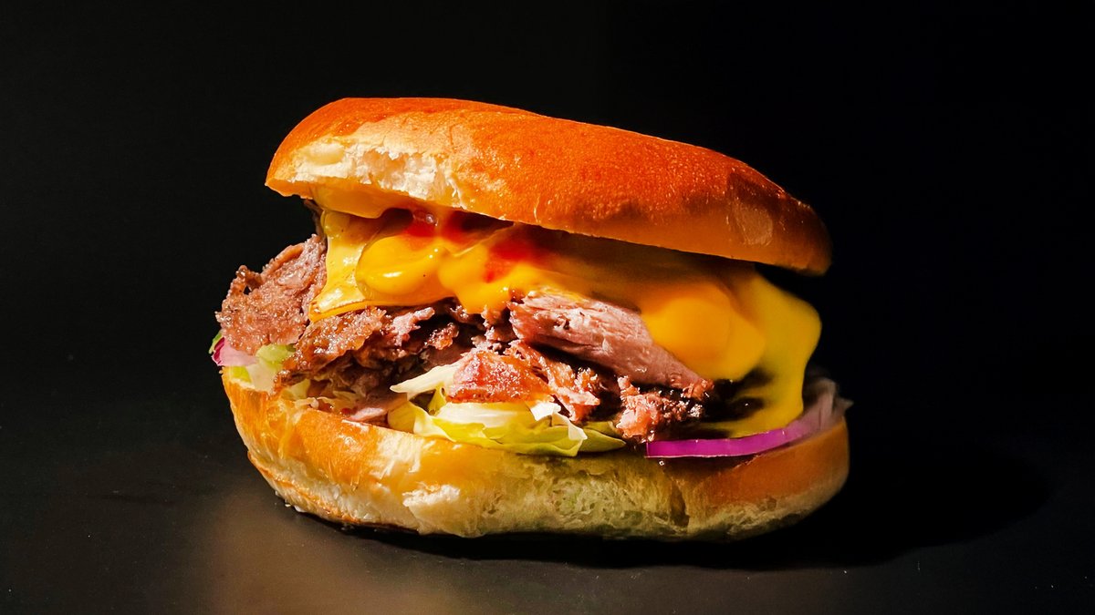Дöнер бургер говяжий (классический). Булка бриошь, дöнерное говяжье мясо, сыр чеддер, айсберг, красный лук, маринованные огурцы, кетчуп и горчица.