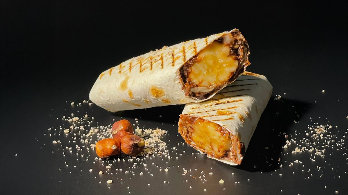 Тандырный бездрожжевой лаваш, банан, шоколадная паста, сгущенное молоко, фундук тертый