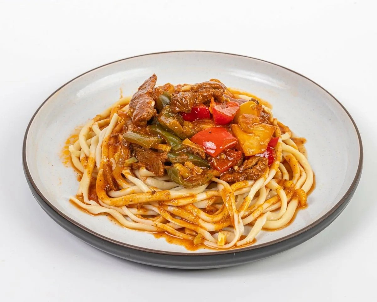 Жареный лагман с мясом, овощами и специями