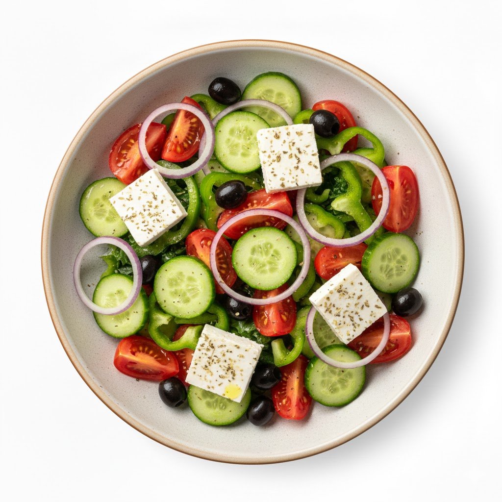 Свежие овощи с мягким сыром и лёгкой заправкой. Лёгкий, сочный и гармоничный вкус с средиземноморским настроением.