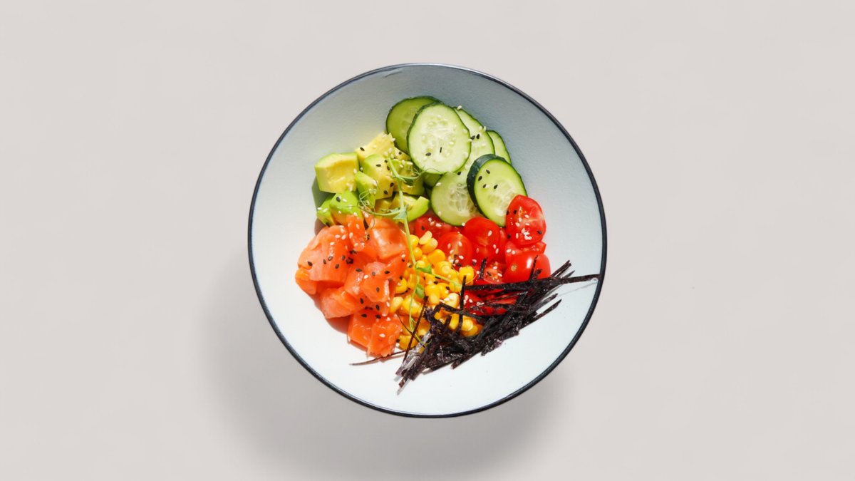 яйца, авокадо, лист салата, огурец, помидоры, хлеб тост, соус сырный, лосось