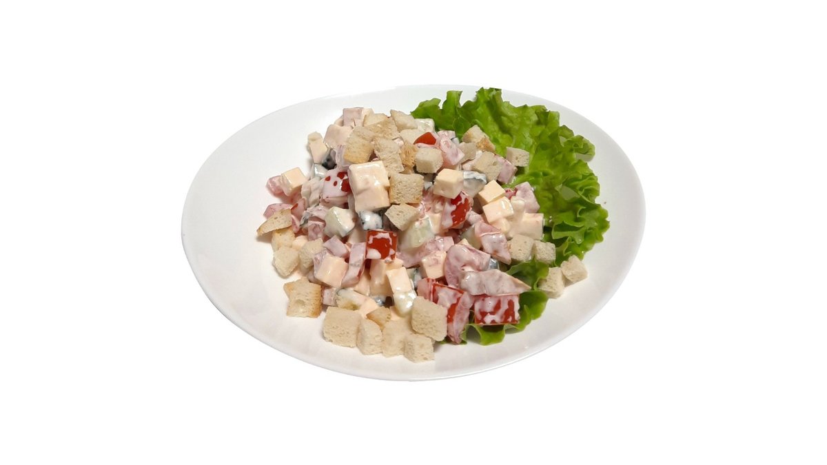 Копченная курица, огурцы, помидоры, сыр, сухари