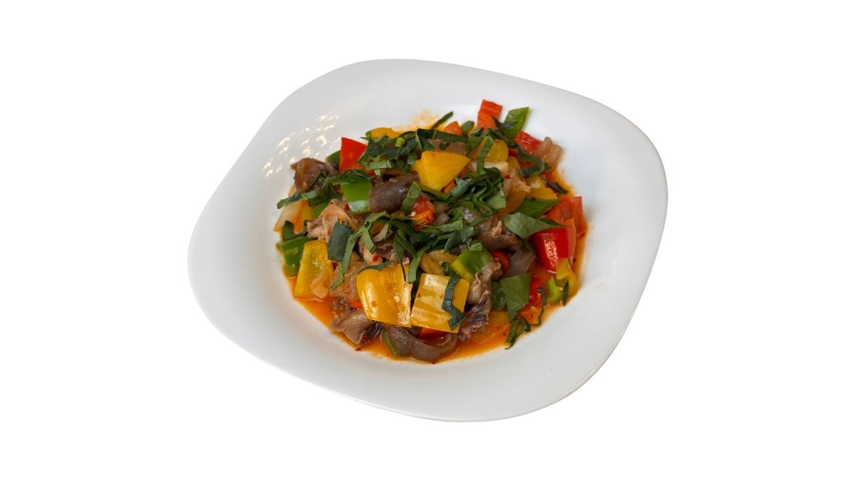 Грибы, говядина, шпинат, перец, стручки фасоли