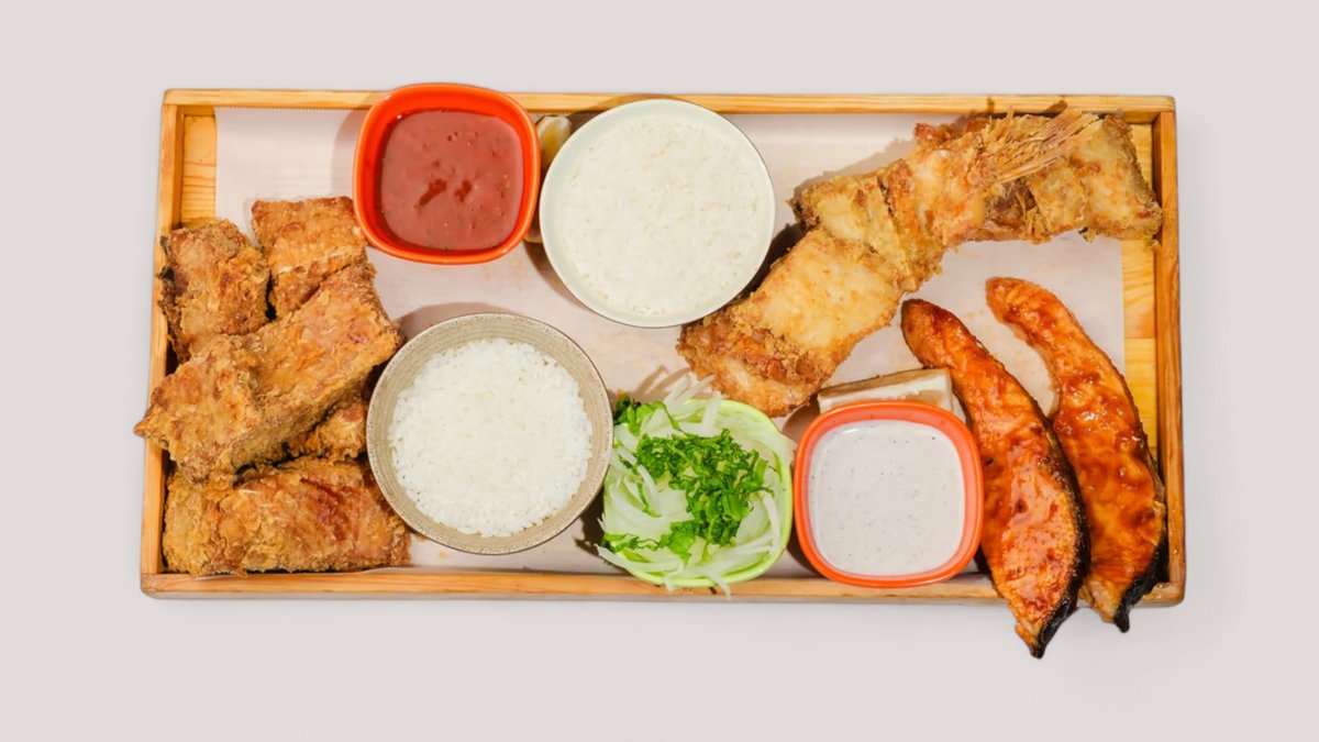 морской окунь - 800 гр, семга - 400 гр, форель на гриле - 350 гр, креветки - 250 гр, рис, фри, соус, лук