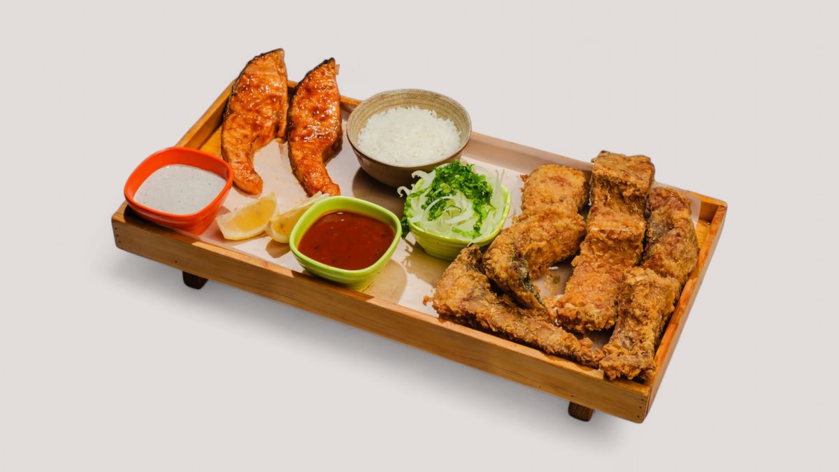 сазан — 500 г, судак — 500 г, семга — 350 г, рис — 2 порции, соус красный и белый ВЕС УКАЗАН В СЫРОМ ВИДЕ