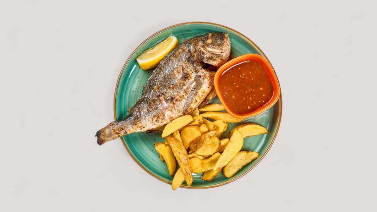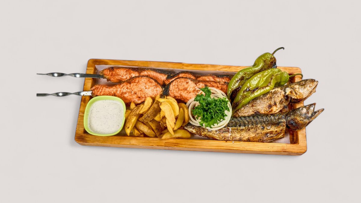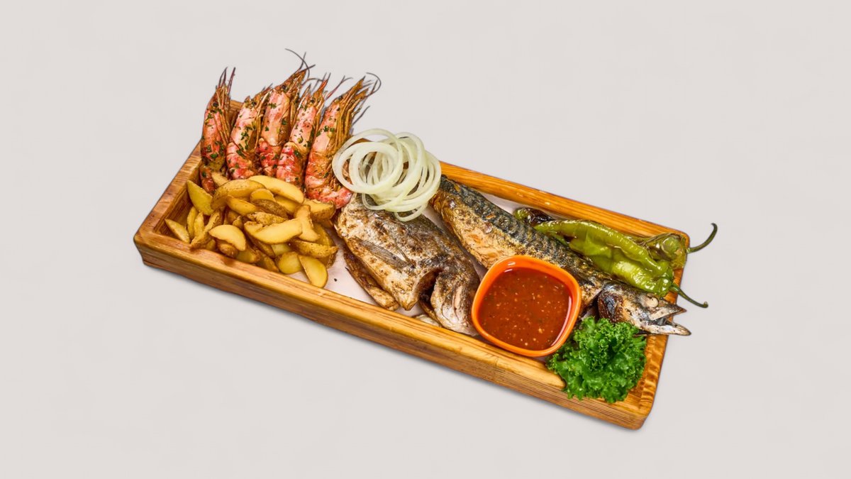 сазан - 500 гр, белый амур или сом (по сезону) - 500 гр, судак - 500 гр, форель на гриле - 400 гр, креветки - 250 гр, фри, картофель по-деревенски, овощи на гриле, соус, лук